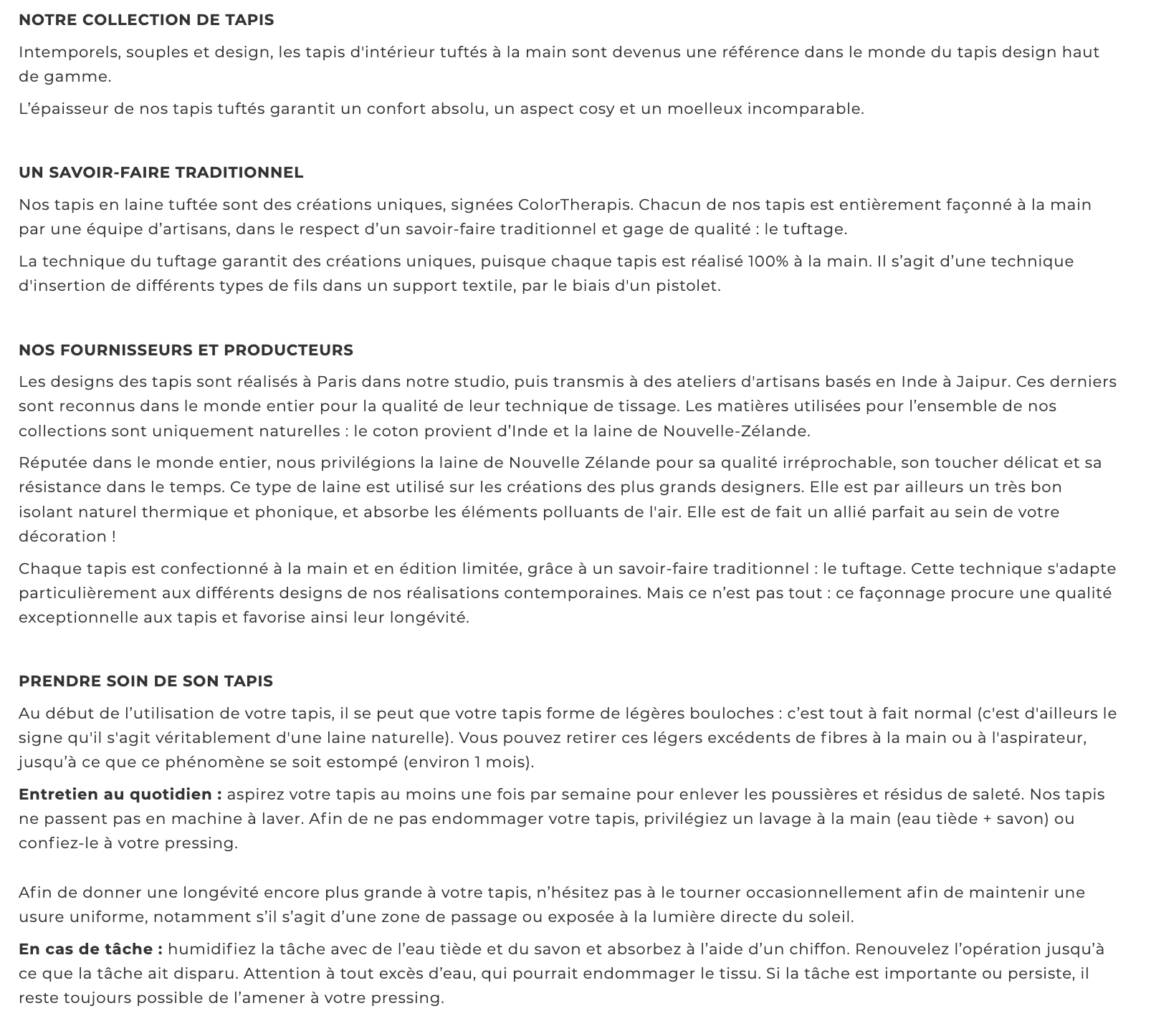 Lavinia et Cyril, les fondateurs de ColorTherapis, m’ont contactée pour un besoin ponctuel : la réécriture de plusieurs éléments de leur site e-commerce. Un audit de leur site internet leur a montré que le duplicate content, en l’occurrence des fiches produits avec le même texte, pénalisait leur SEO. Ils ont donc fait appel à mes services pour créer des phrases personnalisées pour les fiches-produits et également réécrire leur page de présentation des tapis. La commande : ✼ Réécriture de la page collection « Tapis » ✼ Réécriture d’une fiche produit tapis ✼ Réécriture de 3 fiches produits fauteuils