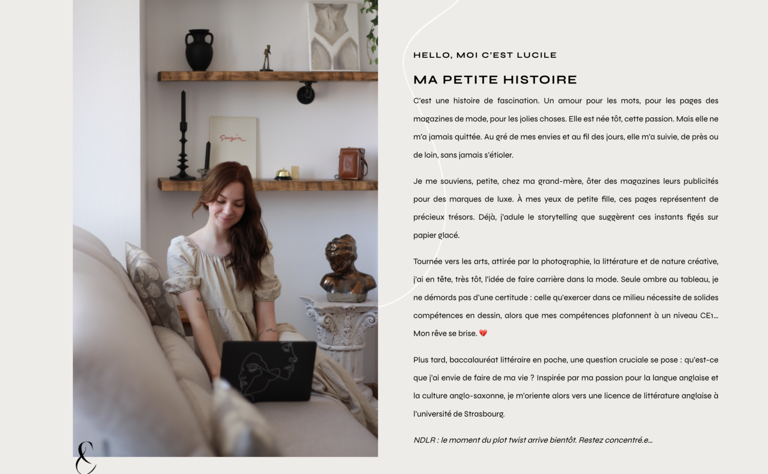 Armée d’une plume sophistiquée, moderne et qui inspire la confiance, je me suis attelée à la rédaction des textes du site de Lucile. Voici ce qu’elle en dit : « Après plus d’un an à bloquer sur les textes de mon site web, je me suis enfin résignée à faire appel à une prestataire. Mon choix s’est naturellement tourné vers Chloé dont les contenus Instagram m’ont séduite. J’ai adoré sa plume et j’ai tout de suite accroché avec son style. Chloé a su trouver les mots justes pour valoriser mon activité et raconter mon histoire avec poésie et savoir-faire. Je ne peux que vous recommander de travailler avec elle : ses textes sont d’une qualité remarquable, les échanges sont fluides et elle est très réactive. Merci encore pour ton travail remarquable et ta bonne humeur qui m’ont booster à avancer sur mon projet de site web. A très bientôt pour une prochaine collaboration ! »
